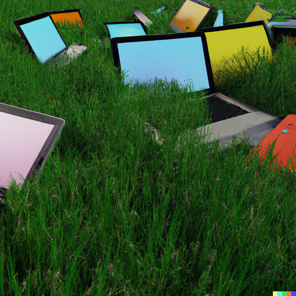"a green field with brand new colored laptops and tablets, digital art"