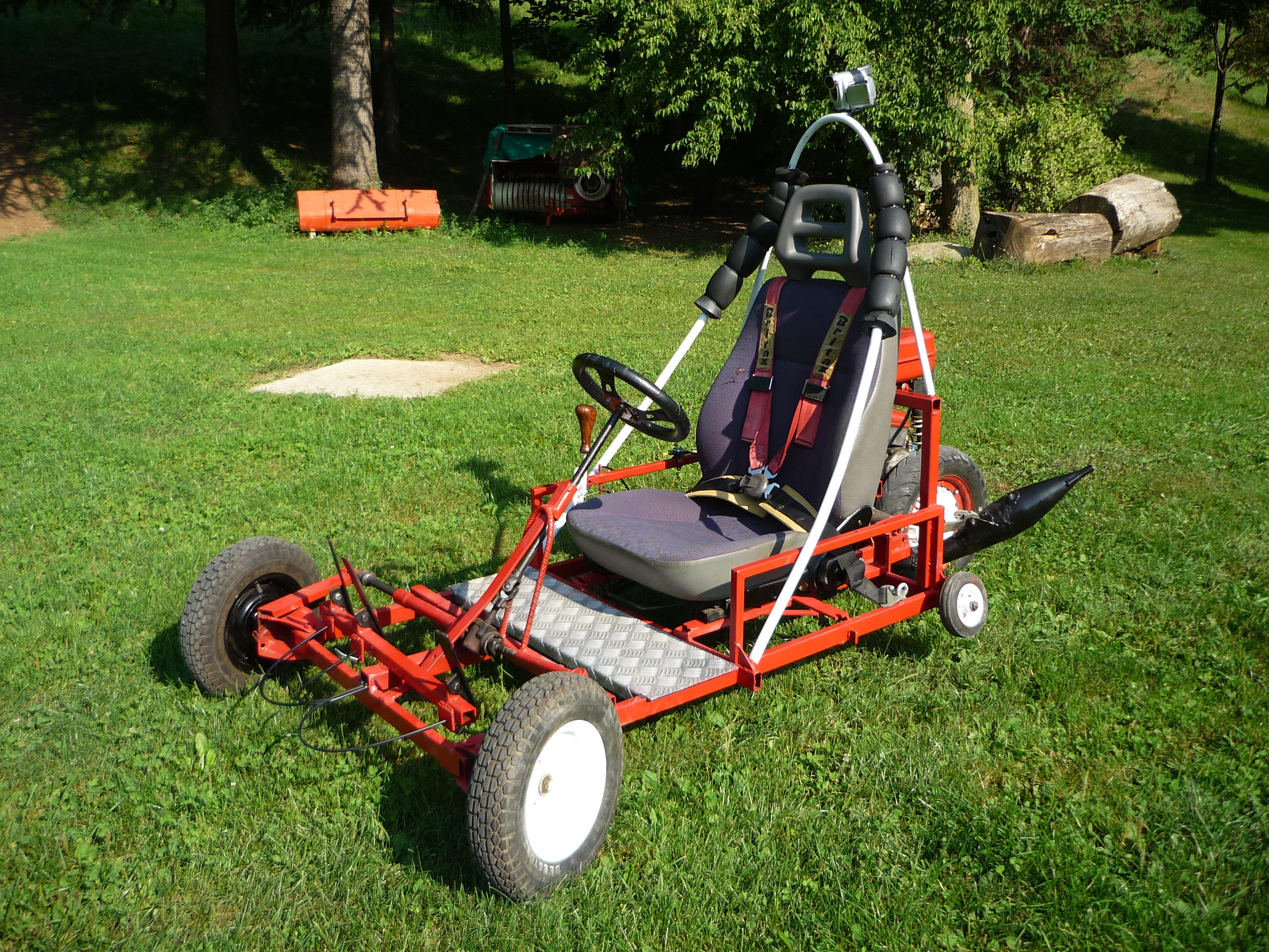The article concludes with a photo of the latest version of the kart, featuring sponge padding on the roll bar, a Fiat Uno seat, a five-point harness, and a small addition: a DIY action camera mounted on top.