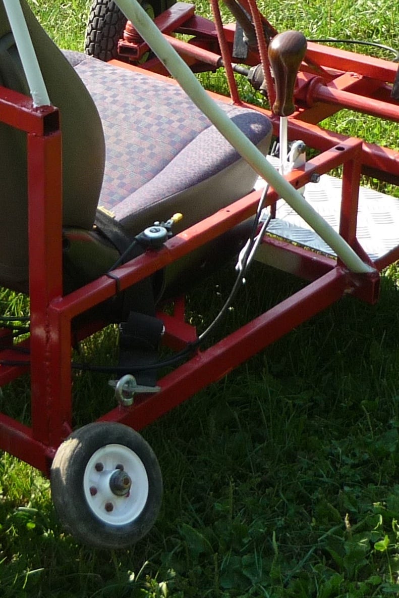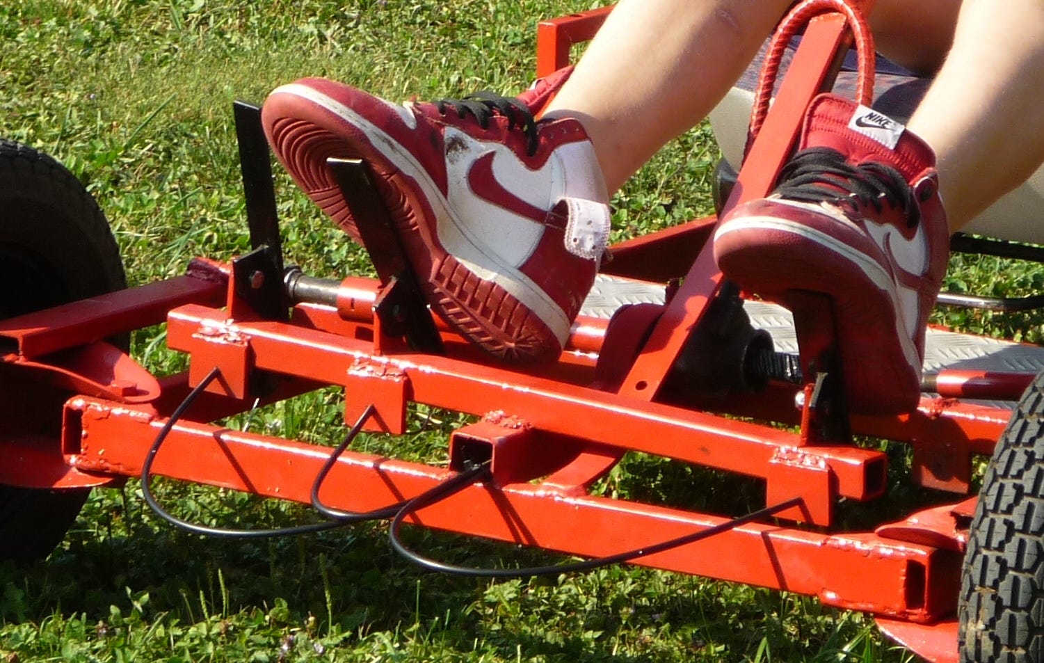 Pedals in the front, gear shift, starter and "roll-saving" wheels on the side